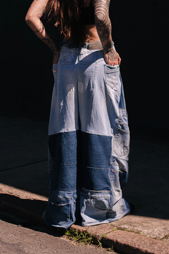 A calça monstro é a peça mais complicada de cortar e montar da Sem nome. Feita de 4 calças, ela tem o corte de cada perna diferente do outro o que dá características únicas para cada uma, sem repetições, destruindo o fast fashion que nunca seria capaz de nada igual.