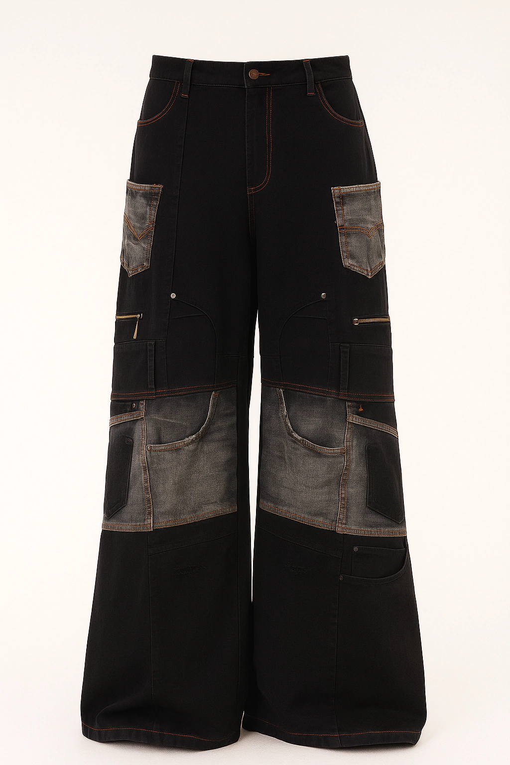 A calça monstro é a peça mais complicada de cortar e montar da Sem nome. Feita de 4 calças, ela tem o corte de cada perna diferente do outro o que dá características únicas para cada uma, sem repetições, destruindo o fast fashion que nunca seria capaz de nada igual.