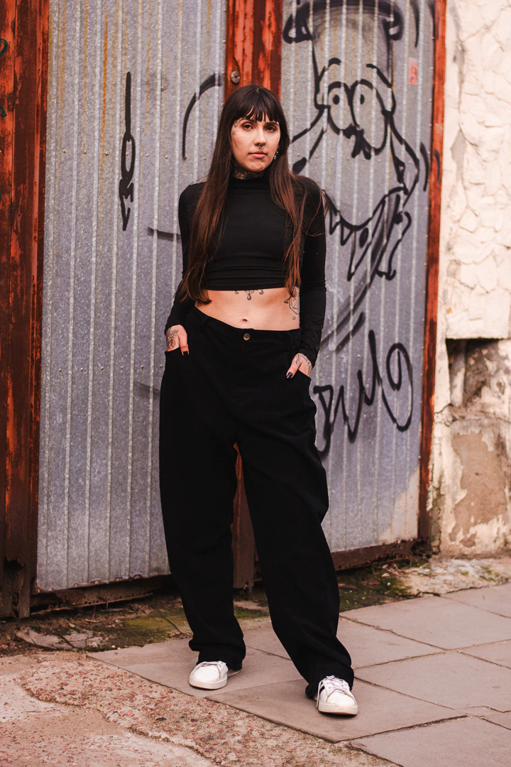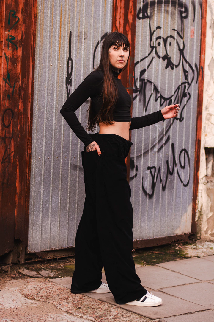 Esta calça foi pensada para unir o casual chique ao street style. Com pregas na parte da frente para melhor movimento do quadril, no cós tem elástico para o melhor conforto, e bolsos nas laterais. Feita em tecido de algodão de descarte textil.