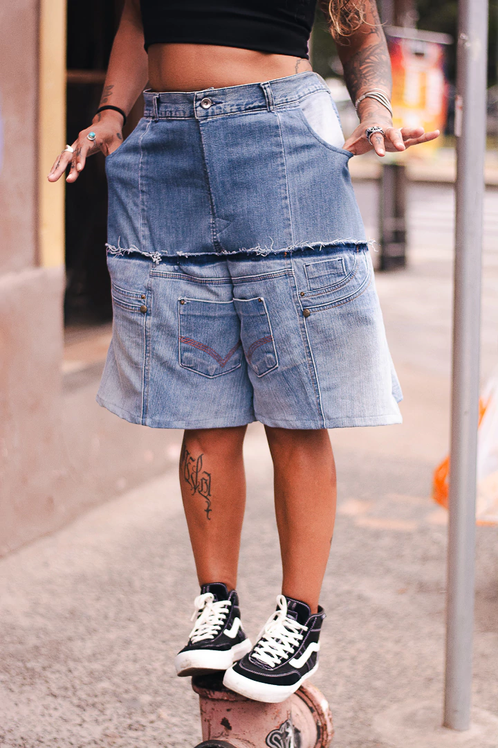 O Jorts ruído é uma peça feita de outras, de retalhos, de tudo que tiver ao nosso alcance. Ele tem dois bolso grandes, mas também pode se descobrir novos conforme for vestindo. Para melhor vestir tem um elástico regulável na cintura para ajuste a cada centímetro.