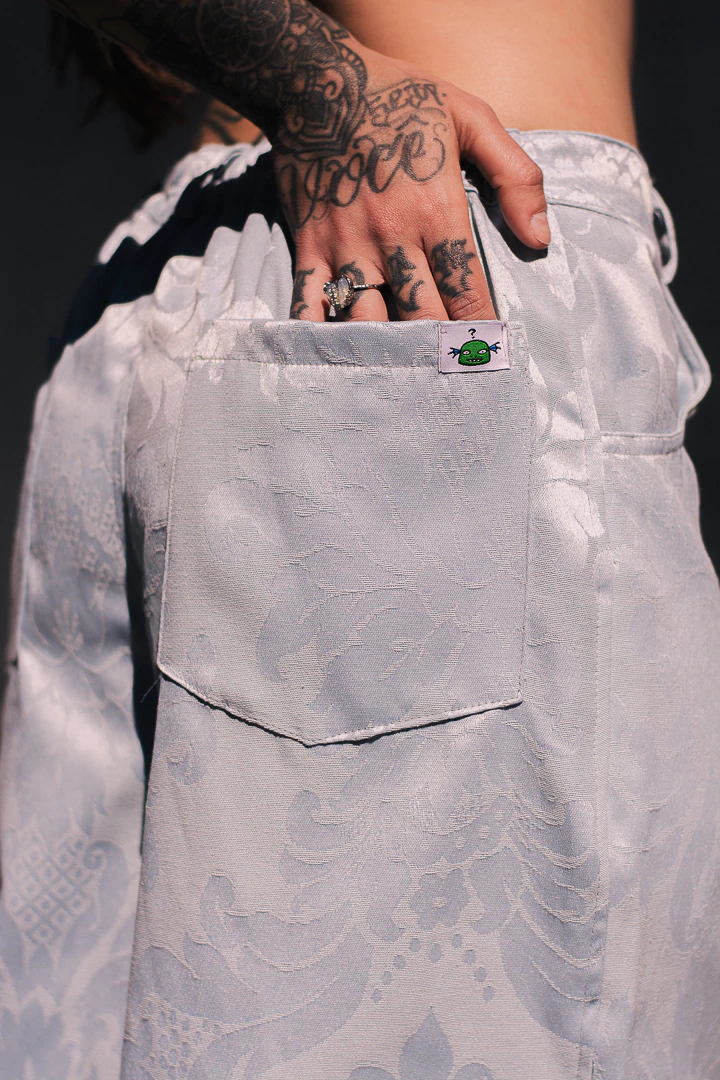 Jorts em tecido jacquard com padronagem em relevo, que une sofisticação e estilo urbano. O modelo possui modelagem ampla com comprimento abaixo do joelho, cintura média com passadores e fechamento por botão e zíper. Os bolsos laterais funcionais trazem praticidade, enquanto o tecido encorpado garante caimento estruturado e visual marcante. Ideal para quem busca uma peça diferenciada que combina moda streetwear e elegância.