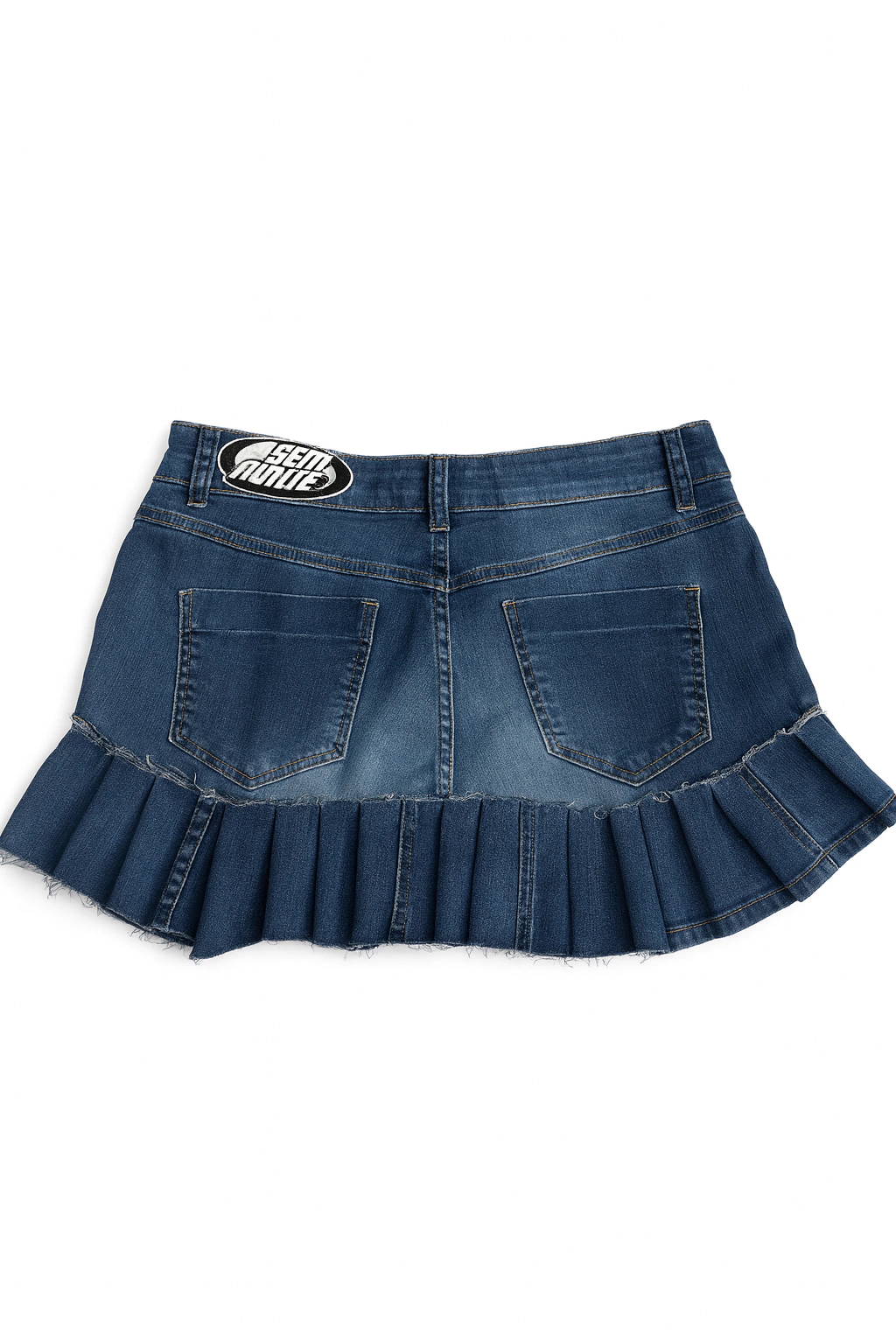 Saia curta confeccionada a partir de jeans reaproveitado, com design que mistura referências utilitárias e femininas. A parte superior traz a estrutura clássica do jeans, enquanto a barra plissada adiciona movimento e contraste ao visual.